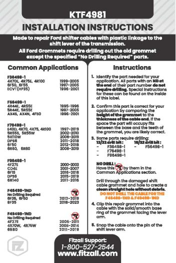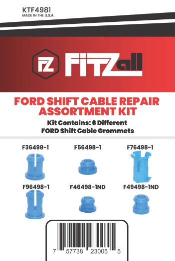 FORD SHIFT CABLE REPAIR ASSORTMENT KIT This kit contains all five Ford shift cable repair grommets ... 1) F36498-1, 1) F56498-1, 1) F76498-1, 1) F96498-1 and 1) F46498-1ND, 1) F49498-1ND
