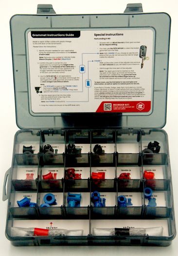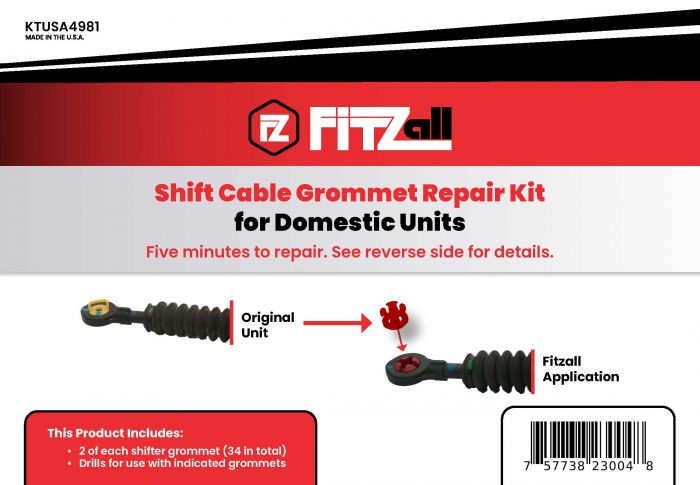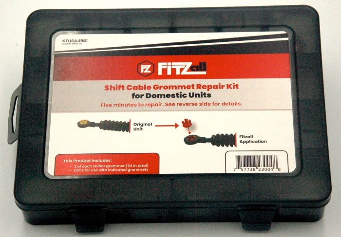 DOMESTIC SHIFT CABLE REPAIR ASSORTMENT KIT This kit contains all of our shift cable repair grommets for domestic vehicles from GM, Ford, and Chrysler... 2) T64498-1A, 2) T74498-1, 2) T74498-1A, 2) T74498-1B, 2) T74498-1C, 2)T14498-1ND, 2)F96498-1, 2)F76498-1, 2)F56498-1, 2)F46498-1ND, 2)F49498-1ND, 2)F36498-1, 2)C22498-T2ND, 2)C82498-1, 2)C92498-1, 2)C72498-1A, 2)C72498-1B, and 2 Drills (15/32 and 13/32)